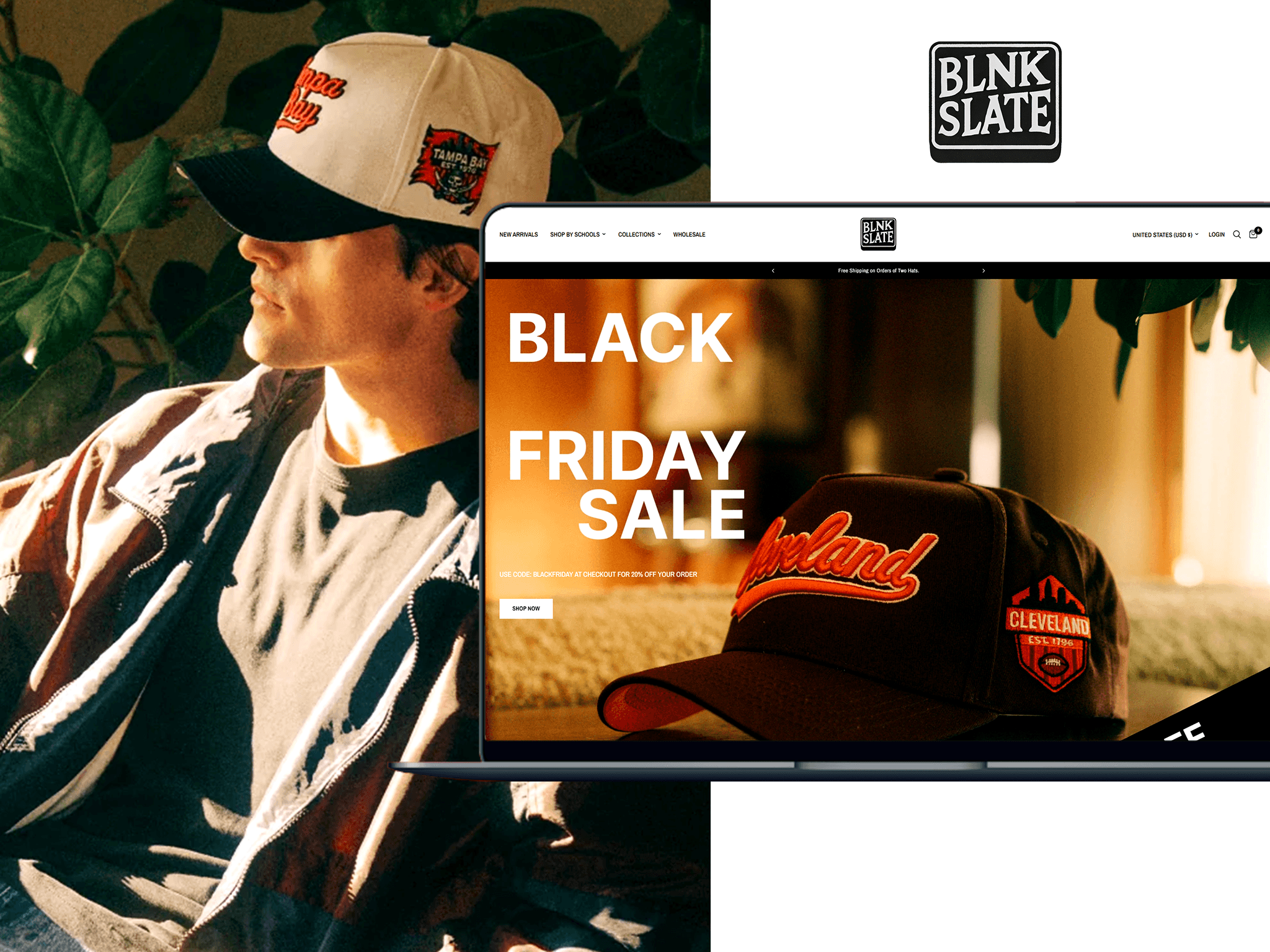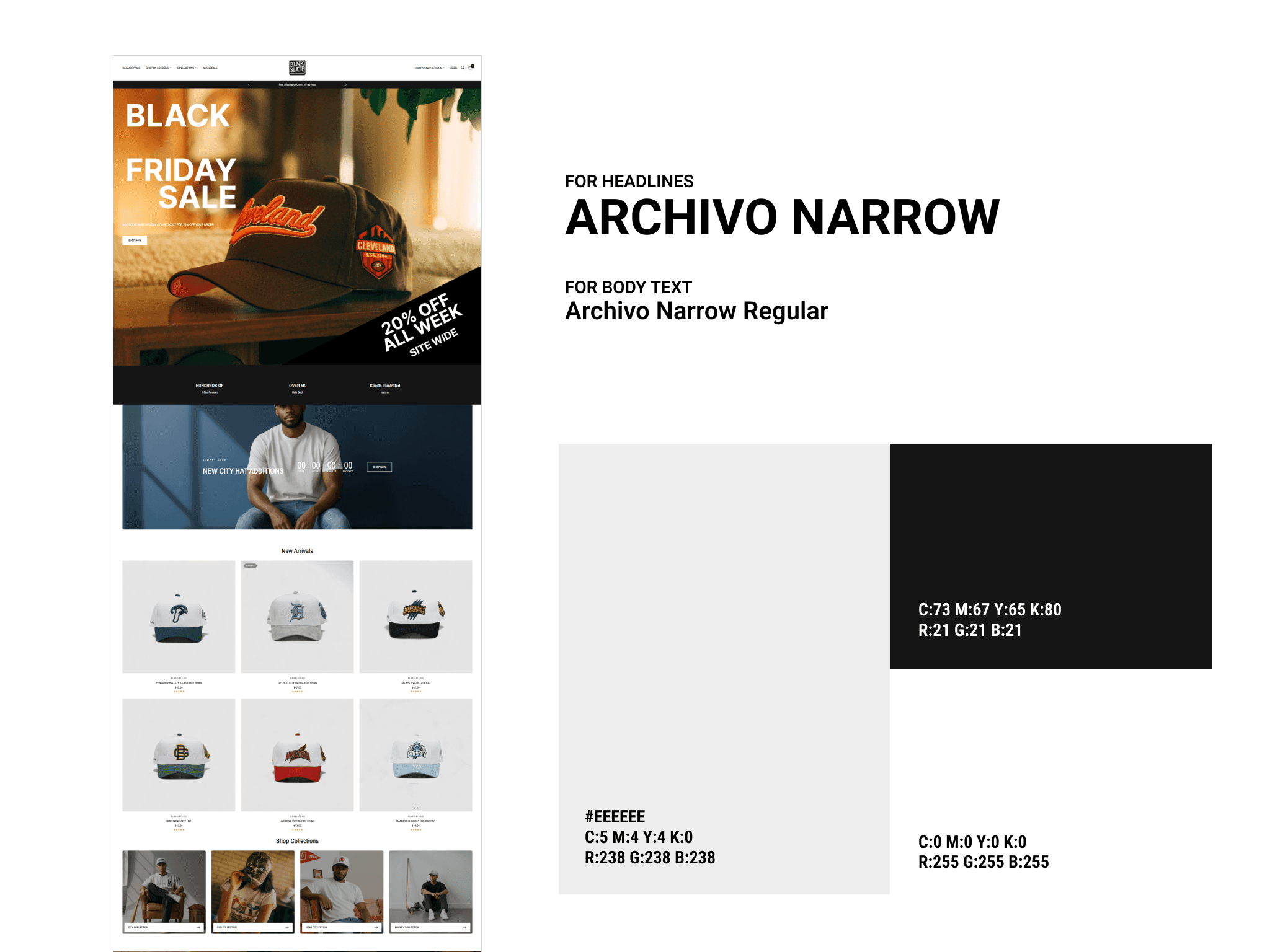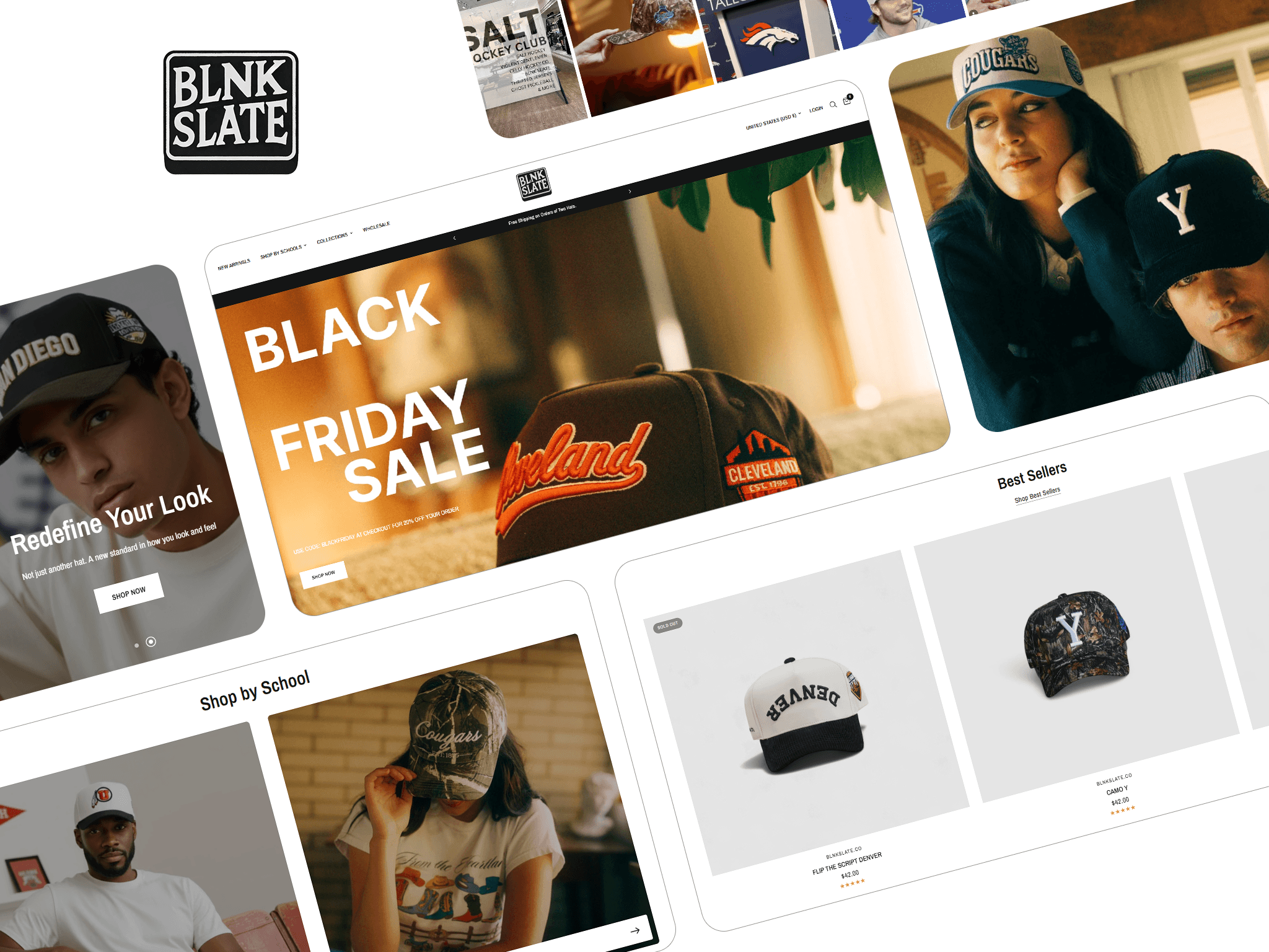 The brand's licensing ambition was woven into the store's identity, positioning Blnk Slate not just as a hat brand but as a brand on the way to something bigger. Mobile experience was rebuilt to match the brand's elevated positioning.